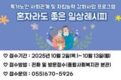 (포탈뉴스통신) 고성군은 10월 2일부터 13일까지 고성군종합사회복지관에서 독거노인 어르신을 대상으로 독거노인 자립 및 사회관계 형성 프로그램 ‘혼자라도 좋은 일상레시피’ 참여자를 모집한다. ‘혼자라도 좋은 일상레시피’ 프로그램은 정서적 안정, 사회적 관계 형성 및 자립 역량 강화를 통해 독거 노인의 건강한 일생생활 도모 기회를 제공하고자 매주 수요일 △공예체험 △천연아로마체험 △요리교실 △신체활동 △미술심리(만다라) △디지털 교육 등 다양한 주제로 10월 15일부터 12월 3일까지 총 8회기 진행될 예정이다. 신청 대상은 고성군에 거주하는 홀로 지내시는 어르신 누구나 참여할 수 있다. 참여 신청은 종합사회복지관 분관에 방문하거나 전화로 신청할 수 있다. 고성군 공식 밴드, 고성군종합사회복지관 홈페이지를 통해 프로그램 참여자 모집 안내를 확인 할 수 있으며 문의 사항은 고성군종합사회복지관으로 문의하면 된다. [뉴스출처 : 경상남도 고성군]