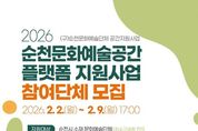 (포탈뉴스통신) (재)순천문화재단은 오는 2월 2일부터 9일까지 지역 문화예술단체의 안정적인 활동 기반을 마련하고, 문화예술 공간을 지역 문화예술 생태계의 거점으로 육성하기 위해 ‘2026 순천문화예술공간 플랫폼 지원사업’에 참여할 문화예술단체를 모집한다. ‘순천문화예술공간 플랫폼 지원사업’은 기존의 임차료 보전 중심 지원 방식에서 벗어나, 문화예술단체의 공간을 예술활동과 예술인간 교류, 시민과의 성과 공유가 유기적으로 이루어지는 공간 기반 문화예술 플랫폼으로 전환하는 데 목적을 두고 있다. 지원 대상은 순천시에서 활동 중인 문화예술단체(최소구성원 7인)로, 단체가 운영하거나 사용하는 공간을 중심으로 연습·연구·발표·교류·시민 참여 등 다양한 예술 활동을 운영하고자 하는 단체라면 신청할 수 있다. 총 20팀 내외를 선발해 단체당 150만원에서 최대 400만원까지 최장 9개월간 단체공간의 순수 임차료를 지원한다. 특히 이번 사업은 공간 운영을 단순한 사용 여부가 아닌, ▲공간을 활용한 예술 활동의 지속성 ▲예술인 간 교류 및 협업 ▲시민과의 소통과 공개 활동 등 공간을 통해 실제로 이루어지는 예술 활