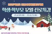 (포탈뉴스통신) 인천광역시교육청은 9일부터 23일까지 인천사이버진로교육원 온라인 화상 시스템을 활용해 ‘학생·학부모 맞춤형 12월 진로특강’을 운영한다. 특강은 ▲학생 대상 ‘꿈을 디자인하는 진로특강’ ▲학부모 대상 ‘자녀의 꿈을 디자인하는 진로특강’으로 운영한다. 학생 대상 특강은 겨울방학을 성장 기회로 삼을 수 있도록 초등학생 ‘겨울방학 생활 계획’과 ‘AI와 친구하기’, 중학생 ‘국어 공부 및 독서 전략’과 ‘학습·진로 체력 기르기’, 예비 고3 ‘2027 대입 전형 분석’ 등 학년별 주제를 다룬다. 학부모 대상 특강은 자녀 진로 지도를 위한 실질적 정보를 제공하기 위해 초·중등 학부모에게는 가정 독서 환경 조성 및 학년별 지원 전략을, 고등 학부모에게는 입시 변화 흐름을 안내한다. 특강은 인천 관내 초·중·고 학생과 학부모 누구나 12월 3일부터 인천사이버진로교육원 누리집에서 신청할 수 있으며, 모든 강의는 실시간 온라인 방식으로 진행된다. 자세한 사항은 진로진학직업교육과 진로교육팀 으로 문의하면 된다. [뉴스출처 : 인천광역시교육청]