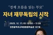 (포탈뉴스통신) 인천광역시교육청평생학습관은 17일 고3 학부모를 대상으로 부모쉼표 특강 ‘경제 흐름을 읽는 부모: 자녀 재무독립의 시작’을 운영한다. 이번 특강은 자녀의 사회진입을 앞둔 학부모가 변화하는 경제 환경을 이해하고, 준비된 시각에서 자녀의 재무독립을 지원하도록 돕는 프로그램이다. 강의는 전 증권사 애널리스트이자 경제·투자 리서치사 ‘광수네 복덕방’의 이광수 대표가 맡아 부모 역할, 경제 변화의 기본 이해, 가정에서 실천 가능한 경제 소통 방법 등을 안내한다. 참여 대상은 인천 관내 고3 및 관심 있는 학부모 100명이며, 신청은 12월 3일 오전 10시부터 평생학습관 누리집에서 선착순으로 받는다. 자세한 사항은 평생학습관 누리집 공지사항 또는 평생교육부로 문의하면 된다. [뉴스출처 : 인천광역시교육청]