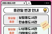 (포탈뉴스통신) 세종특별자치시 시립도서관이 시민 이용 편의 증진과 도서관 운영 효율화를 위해 관내 공공도서관 정기휴관일을 조정한다고 21일 밝혔다. 이번 조정은 지난 8월 행복누림터 내 5개 공공도서관을 대상으로 실시한 이용자 의견조사에 따라 이뤄졌다. 세종시 시립도서관은 조사 결과와 인접 도서관과의 중복된 휴관일 최소화 등 장기적인 운영 여건을 고려해 4개 도서관의 휴관일을 변경하기로 했다. 이에 따라 2026년 1월 1일부터 나성동도서관과 대평동도서관은 토요일에서 일요일로, 보람동도서관과 한솔동도서관은 일요일에서 토요일로 휴관일이 조정된다. 세종시립도서관 관계자는 “이번 휴관일 조정은 시민 의견을 반영해 도서관 이용 편의성을 높이기 위한 것”이라며 “시민 목소리를 지속적으로 수렴해 도서관 운영을 개선해 나가겠다”고 말했다. [뉴스출처 : 세종시]