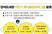 (포탈뉴스통신) 경주시는 시민의 독서문화 향상과 자기계발 기회를 제공하기 위해 ‘2025년 단석도서관 하반기 독서‧문화 프로그램’을 11월 16일부터 12월 17일까지 운영한다고 밝혔다. 이번 프로그램은 경주 시민을 대상으로 △커피의 역사, 향으로 만나다(성인) △도서관에서 만나는 공예(성인) △그림책과 함께하는 창의융합미술(7세~초등학생) 등 총 3개 강좌로 구성됐다. 성인 강좌는 주 1회씩 총 6회, 어린이 강좌는 주말 총 4회 운영되며, 단석도서관 2층 자료실 내 유아실에서 진행된다. 참여 신청은 10월 30일 오전 10시부터 경주시립도서관 홈페이지를 통해 선착순으로 접수하며, 수강료는 무료다. 단, 일부 재료비는 수강생이 부담한다. 자세한 내용은 경주시립도서관 홈페이지를 참고하거나 단석도서관으로 문의하면 된다. [뉴스출처 : 경상북도 경주시]
