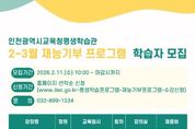 (포탈뉴스통신) 인천광역시교육청평생학습관은 오는 23일부터 ‘재능기부 프로그램’을 운영한다. 이번 프로그램은 시민이 강사로 참여해 자신의 전문성과 경험을 공유하는 참여형 평생학습 활동으로, 매월 새로운 주제의 강좌를 통해 생활 속 배움의 기회를 제공한다. 2월부터 운영되는 강좌는 ‘시니어 요가’, ‘시니어 필라테스’, ‘근력 스트레칭’, ‘나를 닮은 꽃그림’, ‘내 마음속의 논어’ 등 총 5가지이다. 수강 신청은 11일 오전 10시부터 평생학습관 누리집에서 선착순으로 진행되며, 자세한 사항은 누리집의 공지사항을 확인하거나 평생교육부로 문의하면 된다. [뉴스출처 : 인천시교육청]