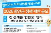 (포탈뉴스통신) 함안군은 지역 발전과 현안 해결을 위해 오는 2월 19일부터 3월 18일까지 ‘2026년 함안군 정책 제안 공모’를 실시한다고 13일 밝혔다. 이번 공모전은 다양한 목소리를 정책에 반영하고, 군정에 대하여 군민이 직접 참여할 수 있는 소통의 장을 마련하기 위해 기획됐다. ‘전 생애를 ‘함안愛’ 담다(부제: 한평생 살고 싶은 함안 만들기)’라는 주제로 창의적이고 실현 가능한 정책을 발굴할 예정이다. 공모주제는 △출산·양육 △지역경제·일자리 △생활·교통 △귀농·귀촌 등 4가지 분야다. 공모에는 함안 군정에 관심 있는 국민 누구나 참여할 수 있다. 접수 방법은 국민신문고 또는 함안군청 누리집 ‘고시·공고’에 있는 제안서를 작성해 함안군청 기획예산담당관으로 방문 또는 우편으로 보내거나, 전자우편으로 제출하면 된다. 접수된 제안은 실시 가능성, 창의성, 계속성 등 종합적인 심사를 거쳐 4월 중 결과를 발표한다. 수상자에게는 금상(100만 원), 은상(50만 원), 동상(20만 원), 장려상(10만 원) 총 4개 부문에서 시상금과 군수 표창이 수여될 예정