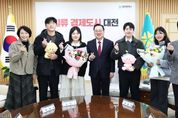 (포탈뉴스통신) 대전시는 20일 시청 응접실에서 청년만남지원사업 ‘연(連) In 대전’을 통해 부부의 연을 맺게 된 결혼 1·2호 커플을 초청해 축하 티타임을 가졌다. ‘연(連) In 대전’은 청년 간 건전한 교류와 자연스러운 만남을 지원해 사회적 네트워크 확장을 돕기 위해 2025년 신규로 추진된 사업으로, 지난해 총 19회차 프로그램을 운영해 744명이 참가했으며, 누적 118쌍의 커플이 탄생했다. 이 가운데 3쌍은 결혼으로 이어지는 결실을 맺었으며, 이번에 초청된 1·2호 커플은 올해 상반기 중으로 결혼을 앞두고 있다. 또 다른 1쌍도 내년 상반기 결혼을 예정하고 있어, 단순한 만남 지원을 넘어 실제 혼인으로 이어졌다는 점에서 정책적 성과를 보여주고 있다. 이날 티타임에 참석한 결혼 1·2호 커플은 이장우 시장과 환담을 나누며 프로그램 참여 소감과 향후 계획 등을 공유하는 시간을 가졌다. 행사 말미에는 기념촬영을 진행해 청년 부부의 새로운 출발을 함께 축하했다. 이장우 대전시장은 “‘연(連) In 대전’을 통해 인연을 맺고 부부가 되는 두 커플을 만나 매우 기쁘고 뿌듯하다”며 “대전에서 사랑을