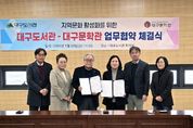 (포탈뉴스통신) 대구문학관과 대구도서관은 지난 1월 30일 독서문화 진흥과 지역문화 활성화를 위한 업무협약을 체결했다. 대구도서관에서 열린 이번 협약식에는 하청호 대구문학관 관장과 권현주 대구도서관 관장 외 각 기관의 실무자들이 참석하여, 두 기관의 상호협력 방안을 공유하며 지역 문학 및 문화예술의 가치 확산을 위한 활동을 공동으로 추진하는 데 뜻을 모았다. 양 기관은 이번 업무협약을 시작으로 앞으로 독서문화 진흥을 위한 사업 발굴 및 추진, 독서문화 프로그램 운영을 위한 전문 강사 및 인력 지원, 전시 및 문학 프로그램 운영 협업 활동을 함께 적극적으로 펼쳐 나갈 계획이다. 양 기관의 대표는 “지역에서 독서 및 문학향유의 중심에 선 두 기관 간의 이번 업무협약을 계기로 앞으로 양질의 창의적인 프로그램 개발을 통해 서로 간의 인적, 물적 교류가 활발하게 이루어져 지역의 독서문화를 선도해 갈 수 있기를 희망한다.”고 이번 업무협약에 대한 기대를 밝혔다. [뉴스출처 : 대구시]