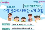 (포탈뉴스통신) 대구 달서구는 아동 정책에 대한 의견을 제시하고 아동권리 증진 활동에 참여할‘아동친화모니터단 4기’단원을 오는 27일까지 모집한다. 달서구 아동친화모니터단은 아동이 행복한‘아동친화도시 달서구’조성을 위한 아동참여기구로, 달서구에 주민등록을 둔 만 7세 이상 18세 미만의 초·중·고등학생 및 학교밖청소년이면 누구나 신청할 수 있다. 모집 인원은 30명 내외다. 공개모집 또는 기관 추천을 통해 선발된 단원들은 4월 위촉식을 시작으로 2년간 활동하며 ▲ 아동친화도시 조성을 위한 정책 제언, ▲ 아동권리 교육 및 캠페인 참여, ▲ 아동권리 모니터링 등 다양한 활동에 참여하게 된다. 달서구는 지난 2020년 1기 출범 이후 아동친화모니터단을 운영하며 아동이 지역사회 정책에 참여하고 아동 권리 증진 활동에 직접 참여할 수 있는 기회를 지속적으로 확대해 왔다. 참여를 희망하는 아동·청소년은 신청서를 작성해 달서구청 아동친화과로 방문 접수하거나 이메일로 제출하면 된다. 신청서 서식은 달서구청 홈페이지 또는 모집 포스터의 QR코드를 통해 내려받을 수 있다. 이태훈 달서구청장