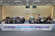 (포탈뉴스통신) 울산 남구는 10일 남구청 대강당에서 2026년도 성적우수 장학생 장학증서 수여식을 개최했다. 이날 수여식에는 이사장인 서동욱 남구청장을 비롯한 장학재단 이사, 장학생과 학부모 등 50여 명이 참석해 자리를 빛냈다. 남구장학재단은 앞서 총 91명의 신청자 중 장학재단이사회 심의를 거쳐 대학생 43명을 최종 선발했으며, 이날 선발된 장학생들에게 장학증서를 수여했다. 장학금은 총 1억 7,200만 원 규모로, 대학생에게 1인 최대 400만 원이 지원된다. 특히 이날 수여식에서는 장학생들이 직접 준비한 감사 퍼포먼스가 진행돼 눈길을 끌었다. 장학생들은 재단과 가족을 향한 감사의 마음을 담아 ‘우리는 남구의 미래다’라는 메시지를 함께 외치며 자신들의 다짐과 성장 의지를 표현했다. 이와 함께 최우수 장학생의 진심 어린 소감도 이어졌다. 간호학과 서수민 학생은 “이번 장학금은 단순한 지원을 넘어, 스스로를 돌아보고 앞으로 나아갈 방향을 다시 다짐하는 계기가 됐다”며 “앞으로 환자를 돌보는 간호인으로서 성실히 성장하고, 받은 도움을 사회에 환원할 수 있는