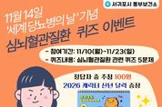 (포탈뉴스통신) 서귀포시 동부보건소는 2025년 ‘세계 당뇨병의 날’을 기념하여 11월 10일부터 11월 23일까지 14일간 모바일 앱 ‘워크온’을 활용한 심뇌혈관질환 퀴즈 이벤트를 운영한다. 이번 퀴즈 이벤트는 지역 주민들에게 고혈압, 당뇨병 등 선행질환을 포함한 심뇌혈관질환에 대한 올바른 정보제공과 건강생활실천 습관을 독려하기 위해 마련됐으며, 서귀포시 동부 지역 주민이라면 모바일 걷기 앱인 ‘워크온(WalkOn)’을 통해 쉽게 참여할 수 있다. 참여 방법은 ‘워크온(WalkOn)’ 앱 내 서귀포시 동부보건소 ‘하영걸을락’ 커뮤니티에 가입한 후, 심뇌혈관질환 퀴즈 5문제를 다 풀고 응모하기 버튼을 누르면 된다. 퀴즈 참여 정답자 중 추첨을 통해서 100명에게는 소정의 기념품도 제공된다. 서귀포시 동부보건소 관계자는 “이번 이벤트로 지역 주민들이 자기 혈관 수치에 관심을 갖고, 스스로 건강관리 계기를 마련했으면 좋겠다”라고 말하며, “많은 사람들이 참여하여 심뇌혈관질환 예방 실천의 중요성을 알고, 더 나아가 주변에 알릴 수 있기를 바란다”라고 했다. [뉴스출처 : 제주도 서귀포시]
