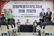 (포탈뉴스통신) 김진태 강원특별자치도지사는 '강원특별법' 군사특례를 활용한 첫 권한 행사로 지난 3월 군사규제 개선 성과를 거둔 철원군을 11월 14일 방문해 도지사 ‘마을진담회’(진솔한 +간담회)의 네 번째 자리를 마련했다. 이번 진담회는 주민과의 소통을 강화하고, 현장의 의견을 보다 폭넓게 듣기 위해 철원군을 김화·갈말권역과 철원·동송권역의 두 개 권역으로 나누어 진행했다. 이날 행사에는 김진태 지사를 비롯해, 한기호 국회의원(춘천, 철원, 화천, 양구을), 이현종 철원군수, 김정수·엄기호 도의원, 이장, 주민자치위원, 노인회 등 각계각층의 주민 300여 명이 참석해 뜨거운 관심 속에 진담회가 시작됐다. 이현종 철원군수는 “이번 방문은 지사님께서 철원을 아끼고 주민의 애로사항을 듣고 신속히 반영하고자 하는 마음의 표현”이라고 말했다. 이어 “철원군은 군사규제 100만평 완화, 농업진흥지역 3만 4천 평 해제 등 규제 개선의 가시적 성과를 이뤄냈다”고 설명했다. 또한, “수돗물 하수처리시설 개선을 위해 도비 약 60~70억 원을 지원받아 추진 중이며, 신철원과 와수 지역은 그동안 여건상 시행하지