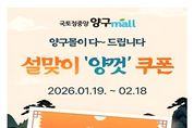 (포탈뉴스통신) 양구 온라인 쇼핑몰 ‘양구몰’에서는 설을 앞두고 오는 2월 18일까지 설맞이 기획전을 진행한다. 양구몰 설맞이 행사는 입점 기업의 매출 증대와 판로 확대는 물론 양구 특산물의 인지도 향상을 위해 마련됐다. 양구몰 회원은 행사 기간 중 매주 화요일 오전 10시에 전 상품 대상 40% 할인쿠폰을 받을 수 있다. 일자별로는 1월 27일, 2월 3일, 2월 10일에 쿠폰을 발급받을 수 있다. 단 할인쿠폰은 한정 수량 발급돼 조기 소진될 수 있다. 양구몰에서는 양구의 유명 특산물인 양구시래기, 사과, 두유, 꿀, 김, 오미자즙, 민들레진액, 나물·장아찌류 등을 판매한다. 이미숙 경제체육과장은 “이번 설맞이 기획전은 양구몰을 찾는 소비자에게는 합리적인 구매 기회를, 지역 소상공인과 농가에는 실질적인 매출 확대 기회를 제공하는 상생형 행사”라며 “앞으로도 온라인 유통 채널을 지속적으로 강화해 양구 특산물이 전국 소비자들에게 더욱 가까이 다가갈 수 있도록 노력하겠다”고 말했다. 한편, 양구몰은 양구의 생산·제조 기업들과 소상공인, 농가들을 대상으로 온라인 판매를 할 수 있도록 지원하는