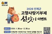 (포탈뉴스통신) 인제군은 2026년 설 명절을 맞아 고향사랑기부제 참여 확산을 위한 특별 이벤트를 오는 1월 26일부터 2월 20일까지 진행한다. 이번 이벤트는 인제군에 10만 원 이상 기부하고, 고향사랑e음 또는 위기브를 통해, 주문한 답례품 후기를 작성하면 자동으로 응모되는 방식으로 운영된다. 응모자 가운데 추첨을 통해 30명을 선정해 강원한우 사골곰탕 선물세트를 제공하며, 당첨자는 2월 23일 이후 개별 문자로 안내할 예정이다. 기부는 온라인 플랫폼인 고향사랑e음과 위기브, 또는 전국 농협은행·농축협 지점을 통해 가능하다. 군은 이번 이벤트를 통해 고향사랑기부제에 대한 인지도를 높이고, 명절을 계기로 기부 참여를 확대해 지역경제 활성화로 이어간다는 계획이다. 김장웅 인제군 지역발전과장은 “설 명절을 맞아 고향을 응원하는 마음이 자연스럽게 기부로 이어질 수 있도록 이번 이벤트를 마련했다.”며 “고향 사랑기부제가 지역에 실질적인 도움이 되는 제도인 만큼 많은 관심과 참여를 바란다.”고 말했다. 한편, 고향사랑기부제는 개인이 주소지 외 지방자치단체에 기부할 경우 세액공제와