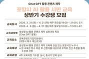(포탈뉴스통신) 포항시는 디지털 전환 시대에 대응해 시민의 정보 활용 역량을 높이기 위해 시민정보화교육과 생성형 AI 활용 특강을 연계 운영하며 시민 대상 교육을 본격 추진하고 있다. 시민정보화교육은 종합운동장 2층에서 3월부터 11월까지 운영되며, 회차당 75명 정원으로 진행된다. 높은 참여율을 보이며 시민들의 관심 속에 1회차 교육이 운영 중이다. 이번 1회차 교육은 컴퓨터 및 인터넷 기초, 엑셀 2021, 스마트폰 활용 등 실생활 중심 과정으로 구성돼 시민들의 디지털 기초 역량 향상에 초점을 맞추고 있다. 2회차 교육은 오는 24일부터 26일까지 접수를 진행한 뒤 3월 30일부터 4월 17일까지 운영될 예정이며 컴퓨터활용능력(2급 실기), ITQ 엑셀, 한글 2022 과정이 개설된다. 교육 신청은 방문·전화 또는 포항시 홈페이지를 통해 가능하며, 교육생은 전산 추첨 방식으로 선발된다. 포항시는 정보화교육과 연계해 생성형 AI 활용 콘텐츠 제작 특강도 함께 운영하고 있다. 특강은 경북콘텐츠기업지원센터에서 진행되며, ChatGPT를 활용한 글쓰기와 콘텐츠 제작 실습 중심으로 구성돼 시