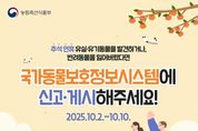 (포탈뉴스통신) 추석 연휴 유실·유기동물을 발견하거나, 반려동물을 잃어버렸다면 국가동물보호정보시스템에 신고·게시해주세요! ■ 추석 연휴 유실·유기동물 구조 통합 신고시스템 운영으로 신속한 온라인 신고·접수 가능 · 기간: 2025.10.2.(목)~10.10.(금) · 신고 게시: 국가동물보호정보시스템 누리집 팝업창 ■ 유실·유기동물 온라인 신고·접수 방법 ① 유실·유기동물을 발견한 경우 국가동물보호 정보시스템 '동물발견' 배너 클릭 → 발견장소, 사진, 개체 특징 등 제보 등록 → 해당 지자체 보호센터 정보제공 → 지자체 동물보호센터 신속 대응 ② 반려동물을 분실한 경우 국가동물보호 정보시스템 '동물분실' 배너 클릭 → 반려동물 분실장소, 일시, 사진 등 정보 등록 → 시민 간 발견 정보 공유(댓글 창 활성화) → 필요시 분실신고 병행(등록동물 정보 변경) 유실·유기동물 구조 통합신고로 보호자를 빠르게 찾아드리겠습니다 [뉴스출처 : 농림축산식품부]