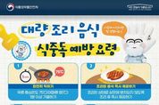 (포탈뉴스통신) ■ 대량 조리 음식 식중독 예방요령 ① 완전히 익히기 육류 중심온도 75°C(어패류 85°C) 1분 이상 가열하기 ② 조리된 음식 즉시 제공하기 조리된 상태로 상온에 방치되지 않도록 조리 후 즉시 제공하기 ③ 가열 조리 후 신속히 냉각하기 가열 조리 후 즉시 섭취하지 않을 시, 여러 용기로 나누어 담거나 신속히 냉각하기 ④ 보관온도 유지하기 따뜻한 음식은 60°C 이상, 차가운 음식은 5°C 이하로 보관하기 ⑤ 재가열하여 섭취하기 보관된 음식 섭취 시, 충분히 가열 후 섭취하기 ■ 운반 시 식중독 예방 요령 · 차량·운반기구 청결히 관리하기 - 오염되기 쉬운 곳 세척·소독하고 청결 상태 수시로 확인하기 · 운반 시 음식 온도 관리 주의 - 따뜻한 음식과 차가운 음식이 서로 닿지 않게 구분하기 · 안전하게 포장하기 - 음식이 새거나 오염되지 않도록 완전히 밀폐되게 포장하기 · 운반 후 즉시 제공하기 - 음식 운반이 완료되면 즉시 제공하기 [뉴스출처 : 식품의약품안전처]