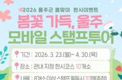 (포탈뉴스통신) 울산 울주군이 봄을 맞아 오는 23일부터 다음달 30일까지 한시 관광이벤트를 진행한다고 20일 밝혔다. 이번 한시 이벤트는 다양한 연계 이벤트로 울주군 방문 관광객의 참여도와 만족도를 높이고, 체류시간과 지역소비를 확대하기 위해 마련됐다. 올해 새롭게 리뉴얼된 K스탬프투어 모바일 앱을 이용한 ‘봄꽃 가득, 울주’ 이벤트와 ‘울주와봄’ SNS 여행후기 인증 이벤트 등으로 구성됐다. ‘봄꽃 가득, 울주’ 이벤트는 울주군 내 지정 봄꽃 명소 10개소 중 8개소 이상을 방문해 스탬프를 획득한 뒤 선물을 신청하면 된다. 주요 코스는 울주군 벚꽃 명소인 △작천정 벚꽃길 △서생포왜성 △두서면 차리마을 벚꽃길 △회야강변 벚꽃길 등이다. 울주군은 이벤트 참여자 중 추첨을 거쳐 총 70명을 선정해 울주특산품을 제공한다. ‘울주와봄’ SNS 여행후기 인증 이벤트는 ‘봄꽃 가득, 울주’ 이벤트 코스 중 1개소의 사진과 울주군 숙박시설, 식당, 카페 중 1개소 영수증을 첨부해 개인 SNS(인스타그램)에 게시하면 된다. 여행후기 작성자 중 70명을 추첨해 울주 특산품을