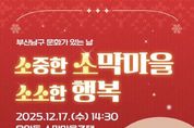(포탈뉴스통신) 부산 남구는 오는 12월 17일 오후 2시 30분, 우암동 소막마을 주택에서 2025 남구 문화가 있는 날 '소중한 소막마을, 소소한 행복' 공연을 개최한다고 밝혔다. 이번 공연은 역사적 의미가 담긴 소막마을 주택을 지역 문화공간으로 활용하여, 주민들이 일상에서 자연스럽게 문화예술을 접할 수 있도록 마련됐다. 무대는 마술 풍선쇼, 합창, 퓨전국악, 트로트 등 다양한 장르로 구성되어 남녀노소 누구나 부담 없이 즐길 수 있는 무대로 꾸며진다. 특히 소막마을 주택의 아늑한 분위기가 더해져 ‘작지만 소중한 행복’을 나누는 따뜻한 연말 공연이 될 것으로 기대된다. 오은택 남구청장은 “일상 가까이에서 이웃과 함께 문화를 즐기는 경험은 지역 공동체의 정서 교류에 큰 의미가 있다”며 “많은 분이 오셔서 따뜻한 무대와 즐거운 공연을 함께하시길 바란다”고 전했다. [뉴스출처 : 부산시남구]