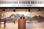 (포탈뉴스통신) 지난 26일, 고양문화원에서 열린 ‘고양문화아카데미 최고위과정’제5기 수료식에 이동환 고양시장이 참석해 6개월간의 대장정을 마친 수료생들을 격려하고, 지역 리더로서의 새로운 출발을 축하했다. 지난 2023년 9월 첫발을 뗀 문화아카데미는 이번 5기 수료생을 포함해 현재까지 총 180여 명의 지역 리더를 배출하며, 고양특례시의 지성과 인문학적 통찰을 상징하는 전당으로 확고히 자리 잡았다. 이날 수료식에는 이동환 고양특례시장을 비롯해 선배 수료생 등 100여 명이 참석하여, 배움의 결실을 맺은 5기 수료생들을 아낌없이 축하했다. 이번 문화아카데미 과정에는 기업 CEO, 공직자, 법조인 등 지역사회의 다양한 리더들이 참여해 수준 높은 지적 교류를 나누며 탄탄한 인적 네트워크를 구축했다. 특히 유현준 홍익대 교수, 신병주 건국대 교수, 김민식 세명대 교수 등 국내 최고 수준의 강사진을 통한 이론 강의는 물론, 문화유산 답사와 미술관 견학, 뮤지컬 관람 등 현장 경험을 아우르는 입체적인 융복합 커리큘럼이 진행돼 수강생들에게 큰 호응을 얻었다. 수료식에 참석한 이동환 시장은 “추운