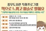(포탈뉴스통신) 김포시 풍무도서관은 가정의 달을 맞아 만 4~5세 어린이를 둔 김포가족을 대상으로 ‘책으로 느끼고 미술로 말해요’를 오는 5월 12일부터 5월 26일까지 매주 화요일 오후 4시부터 6시까지 총 3회에 걸쳐 운영한다. 프로그램은 그림책예술심리 전문기관인 하루마음 김은지 대표가 진행한다. 참여자들은 차수별 주제도서를 함께 읽은 후 다양한 미술활동을 통해 가족 간 정서적 교감을 나누는 시간을 가질 예정이다. 해당 프로그램의 취지에 따라 1회차는 어린이 단독 참여로 운영되며, 2회차부터는 보호자 동반 참여가 필수다. 4월 21일 오전 10시부터 풍무도서관 홈페이지를 통해 신청할 수 있으며, 만 4~5세 어린이를 둔 김포가족 7팀을 선착순으로 모집한다. [뉴스출처 : 경기도 김포시]