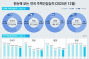 (포탈뉴스통신) 국토교통부는 2025년 12월 기준 주택 통계를 공표했다. 2025년 12월 주택 인허가, 착공, 분양, 준공 실적은 12월 수도권 인허가는 82,077호로 전년동월(119,541호) 대비 31.3% 감소, 12월 누적 실적은 222,704호로 전년동기(234,083호) 대비 4.9% 감소했다. 서울 지역 12월 인허가는 2,576호로 전년동월(18,441호) 대비 86.0% 감소, 12월 누적 실적은 41,566호로 전년동기(51,452호) 대비 19.2% 감소했다. 비수도권 12월 인허가는 20,712호로 전년동월(39,904호) 대비 48.1% 감소, 12월 누적 실적은 157,130호로 전년동기(201,151호) 대비 21.9% 감소했다. 12월 수도권 착공은 40,344호로 전년동월(29,965호) 대비 34.6% 증가, 12월 누적 실적은 166,823호로 전년동기(163,255호) 대비 2.2% 증가했다. 서울 지역 12월 착공은 10,050호로 전년동월(3,620호) 대비 177.6% 증가, 12월 누적 실적은 32,119호로 전년동기(26,066호) 대비