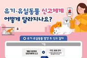 (포탈뉴스통신) 유기·유실동물 신고체계 어떻게 달라지나요? ■ 유기·유실동물 발견 후 신고 절차 (기존) 개별 지방정부 담당자에게 신고 → 구조, 보호 조치 *지역별로 동물보호센터 등에서 현장 출동 후 구조·보호 (개선) 방법 ① 개별 지방정부 담당자에게 신고 → 구조, 보호 조치 *지역별로 동물보호센터 등에서 현장 출동 후 구조·보호 방법 ② 동물보호상담센터 ☎1577-0954(1) → 관할 지방정부 전화 자동 연결 → 구조, 보호 조치 *지역별로 동물보호센터 등에서 현장 출동 후 구조·보호 방법 ③ 국가동물보호정보시스템 접수 → 접수 내용 관할 지방정부 전달 → 구조, 보호 조치 *지역별로 동물보호센터 등에서 현장 출동 후 구조·보호 [뉴스출처 : 농림축산식품부]