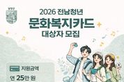 (포탈뉴스통신) 담양군은 관내 청년을 대상으로 문화생활 향유 및 자기 계발 기회를 제공하고자 전남청년 문화복지카드 지원사업을 추진한다고 9일 밝혔다. 주소지 읍·면 사무소 방문 신청은 2월 9일부터 3월 31일까지, 농협카드 누리집 신청은 2월 20일부터 3월 31일까지 가능하며 기존 수혜자도 반드시 다시 신청해야 한다. 다만 공공기관 근무자, 학교 밖 청소년 수당 대상자, 여성농업인 행복바우처 대상자는 제외되며, 문화누리카드 수혜자는 중복 지원을 받을 수 있다. 2024년 2월 9일 이전부터 도내 거주한 19~28세 청년을 대상으로 하며, 연 25만 원의 문화복지비가 지원된다. 지원금은 문화·공연 관람, 학원 수강, 도서 구입 등 문화·여가 및 자기 계발 분야에서 사용할 수 있으며, 전남 도내에서 올해 안에 모두 사용해야 한다. 군 관계자는 “전남청년 문화복지카드 지원사업을 통해 청년들의 문화 참여 기회를 넓히고 삶의 질을 높이는 계기가 되길 바란다”라며 “앞으로도 청년의 수요를 반영한 문화·복지 정책을 추진해 청년이 머물고 성장할 수 있는 담양을 만들어 가겠다”라고 말했다. [뉴