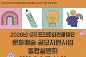 (포탈뉴스통신) 포천문화관광재단은 오는 2월 6일 포천반월아트홀 소극장에서 ‘2026년 문화예술 공모지원사업 통합설명회’를 개최한다. 이번 통합설명회는 지역 예술인과 예술단체를 대상으로 2026년 추진되는 문화예술 공모지원사업 전반을 소개하고, 사업에 대한 이해도를 높여 참여를 활성화하기 위해 마련됐다. 설명회는 2023년부터 매년 개최되고 있으며, 지역에서 활동하는 예술인들과 직접 소통하며 활동 과정에서의 어려움을 공유하고, 지원사업의 수행 방법과 개선 의견을 나누는 자리로 활용되고 있다. 2026년 포천문화관광재단이 추진하는 문화예술 공모지원사업은 총 4개 사업, 약 3억 2천만 원 규모로, 주요 사업은 ‘포천에 도착한 당신의 예술(포·도·당)’, 경기예술지원사업 ‘포천 모든예술31’, 경기 민간문화공간 활성화 사업 ‘포천 모든공간31’, ‘장애인 문화예술 진흥사업’이다. ‘포천에 도착한 당신의 예술(포·도·당)’은 지역 예술인의 지속 가능하고 자생적인 창작활동 기반을 마련하고 시민의 문화예술 향유 기회를 확대하기 위해 2021년부터 추진해 온 사업으로, 전문예술, 청년예술, 생활문화, 문화예