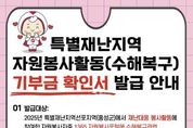 (포탈뉴스통신) 홍성군자원봉사센터는 지난해 군에 기록적인 폭우가 내리며 특별재난지역으로 선포됨에 따라, 수해복구 현장에서 자원봉사활동에 참여한 자원봉사자를 대상으로 ‘특별재난지역 자원봉사용역 등에 대한 기부금 확인서’를 발급한다고 밝혔다. 이번 기부금 확인서는 특별재난지역 수해복구에 참여한 자원봉사자의 봉사활동을 사회적으로 인정하고, 연말정산 및 종합소득세 신고 시 소득공제 혜택을 받을 수 있도록 지원하기 위한 것이다. 발급 대상은 2025년 홍성군 수해복구 자원봉사활동에 참여하고, 1365자원봉사포털에 수해복구 관련 봉사시간이 입력된 자원봉사자이며, 신청은 내달 13일까지이다. 신청을 희망하는 자원봉사자는 홍성군자원봉사센터 공지사항을 참고하여 기부금 확인서 서식을 내려받아 파란색 표시된 항목을 작성한 후, 기관 이메일(cnvc14@v1365.or.kr)로 제출하면 되고, 방문 접수를 희망할 시 센터로 직접 방문하거나, 가까운 읍·면행정복지센터에 제출하면 된다. 발급된 기부금 확인서는 연말정산 시 소득공제 항목에 기재하여 증빙자료로 제출하거나, 종합소득세 신고 시 활용할 수 있다. 기부금 공제금액은